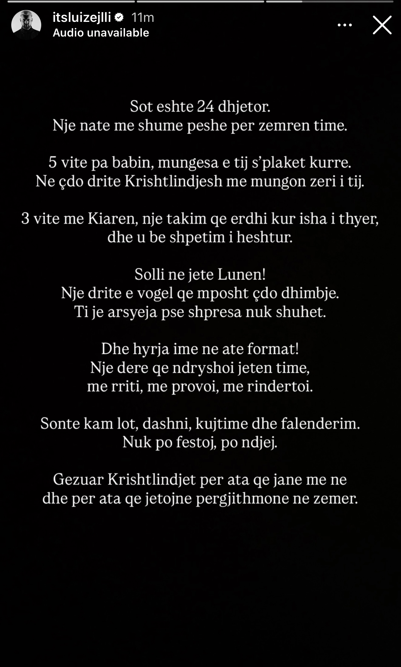 Përmes një postimi reflektues, këngëtari rrëfen se data 24 dhjetor për të nuk është festë, por një natë e rëndë kujtimesh dhe emocionesh. Ai kujton me dhimbje mungesën e babait, duke theksuar se kanë kaluar pesë vite pa të, por boshllëku nuk është mbushur kurrë. Sipas Luizit, çdo Krishtlindje vjen me të njëjtën mungesë dhe të njëjtën dhimbje që nuk shuhet.